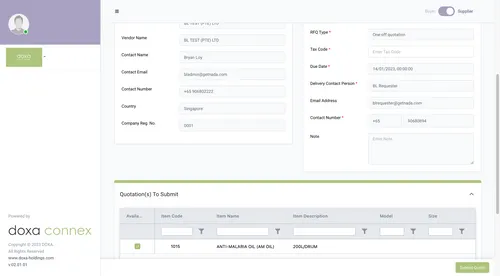 1. Send RFQs. For vendors not on board the Doxa Connex system, they will receive a link via email and respond to it, including the ability to make price adjustments.